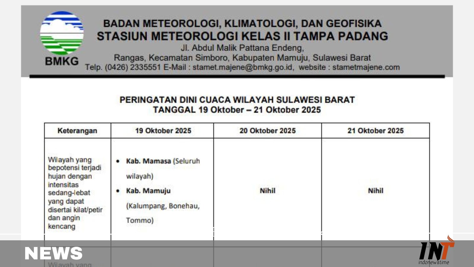 BPBD Sulbar Terima Informasi Peringatan Dini Cuaca 19-21 Oktober 2025 dari BMKG Kelas II Tampapadang